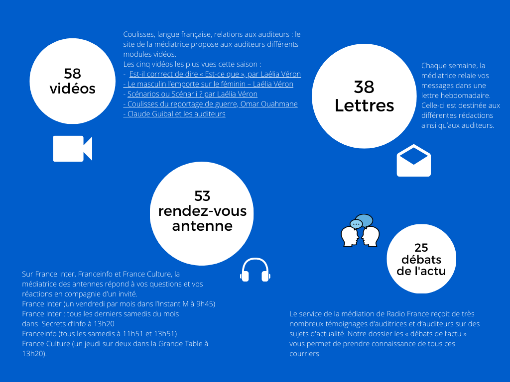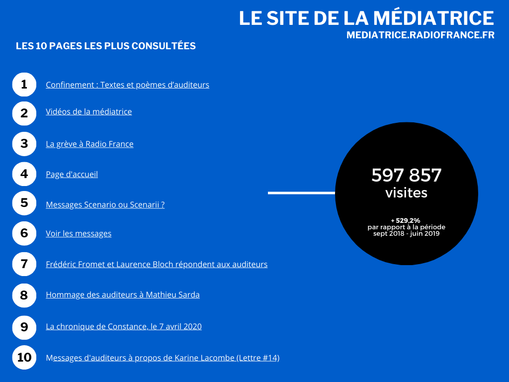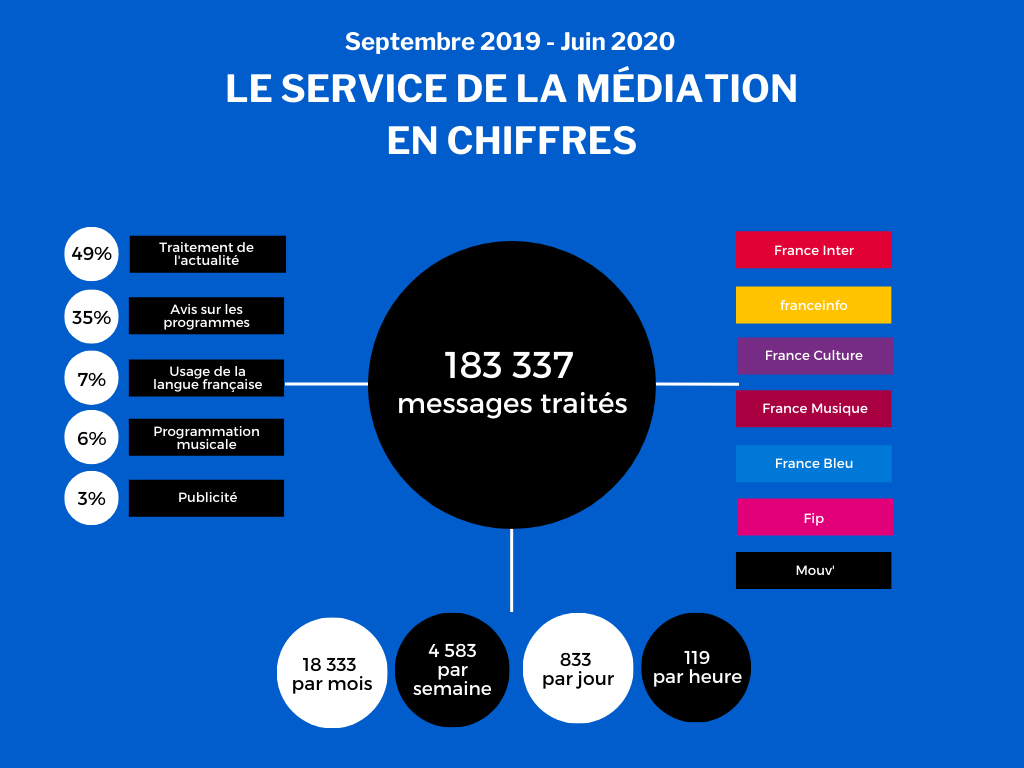 Chiffres, thématiques des messages d’auditeurs, articles les plus consultés, vidéos… Nous vous proposons le bilan chiffré du service de la médiation pour la saison 2019-2020.