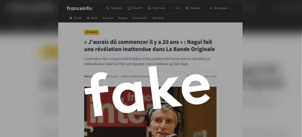 Ce message, particulièrement soigné dans sa forme, reprend les codes graphiques du site de Franceinfo et met en scène Nagui dans son émission « La bande originale » sur France Inter. Dans cette séquence, l’animateur fait la promotion de prétendus placements financiers auprès de Leila Kaddour. Le message renvoie vers des pages imitant fidèlement l’environnement éditorial de Franceinfo afin de renforcer sa crédibilité et d’inciter à cliquer.