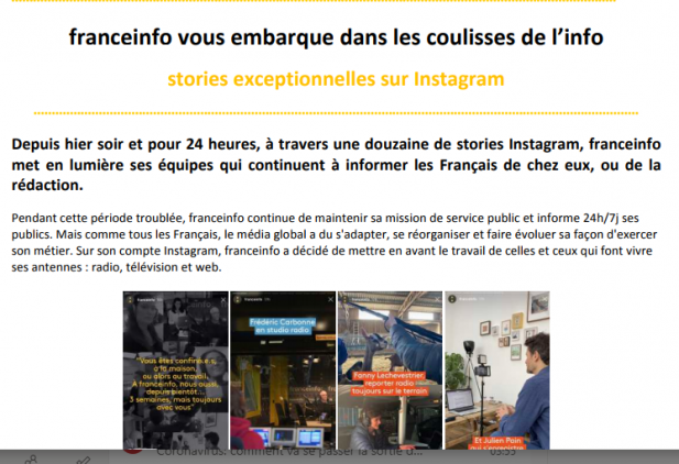Sur Franceinfo, une journée spéciale : les journalistes de l’antenne feront découvrir les coulisses du travail des équipes d’un hôpital de l’AP-HP qui se battent pour sauver des vies pendant cette crise sanitaire. Cette journée sera le coup d’envoi d’un dispositif éditorial spécial pour mettre à l’honneur les soignants des hôpitaux de l’AP-HP : Franceinfo diffusera leurs témoignages chaque jour à 20 heures. Dans le cadre de cette collaboration de longue durée, une série de podcasts sera ensuite programmée autour du thème de la santé et des virus- à noter : Franceinfo première plateforme d’information consultée au quotidien qui franchit pour la première fois de son histoire la barre des trois millions de visiteurs uniques quotidiens (février 2020).