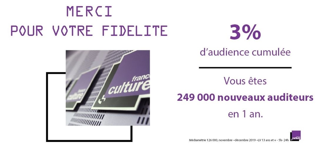 France Culture franchit pour la première fois le cap des 3,0% d’audience cumulée (+0,5 pt en un an). 1 625 000 auditeurs écoutent quotidiennement la chaîne (+ 249 000 en un an). Ces résultats témoignent de la puissance éditoriale de l’antenne culturelle de Radio France.